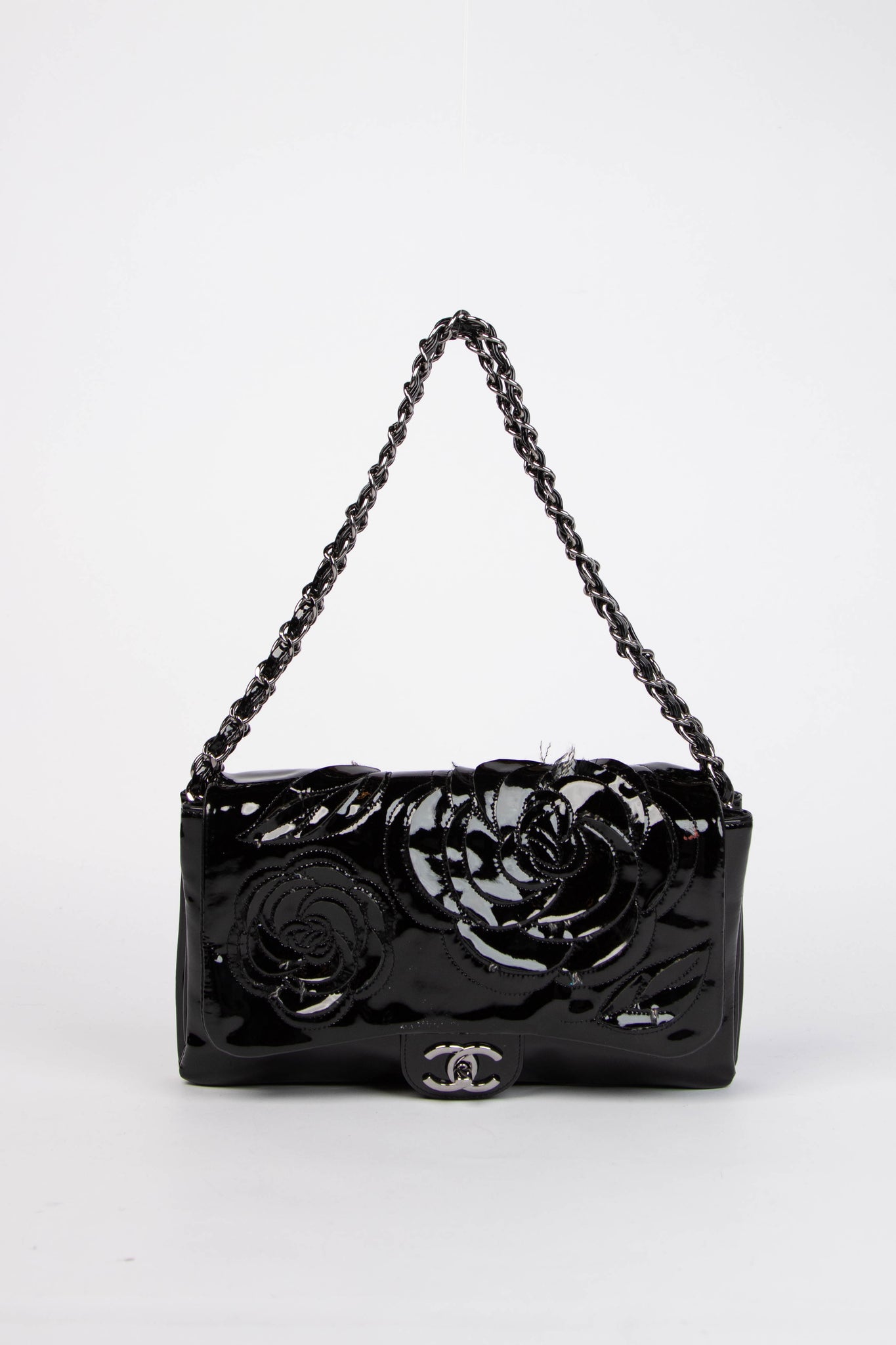 2010s Chanel Black Patent Leather Camellia Flap Bag