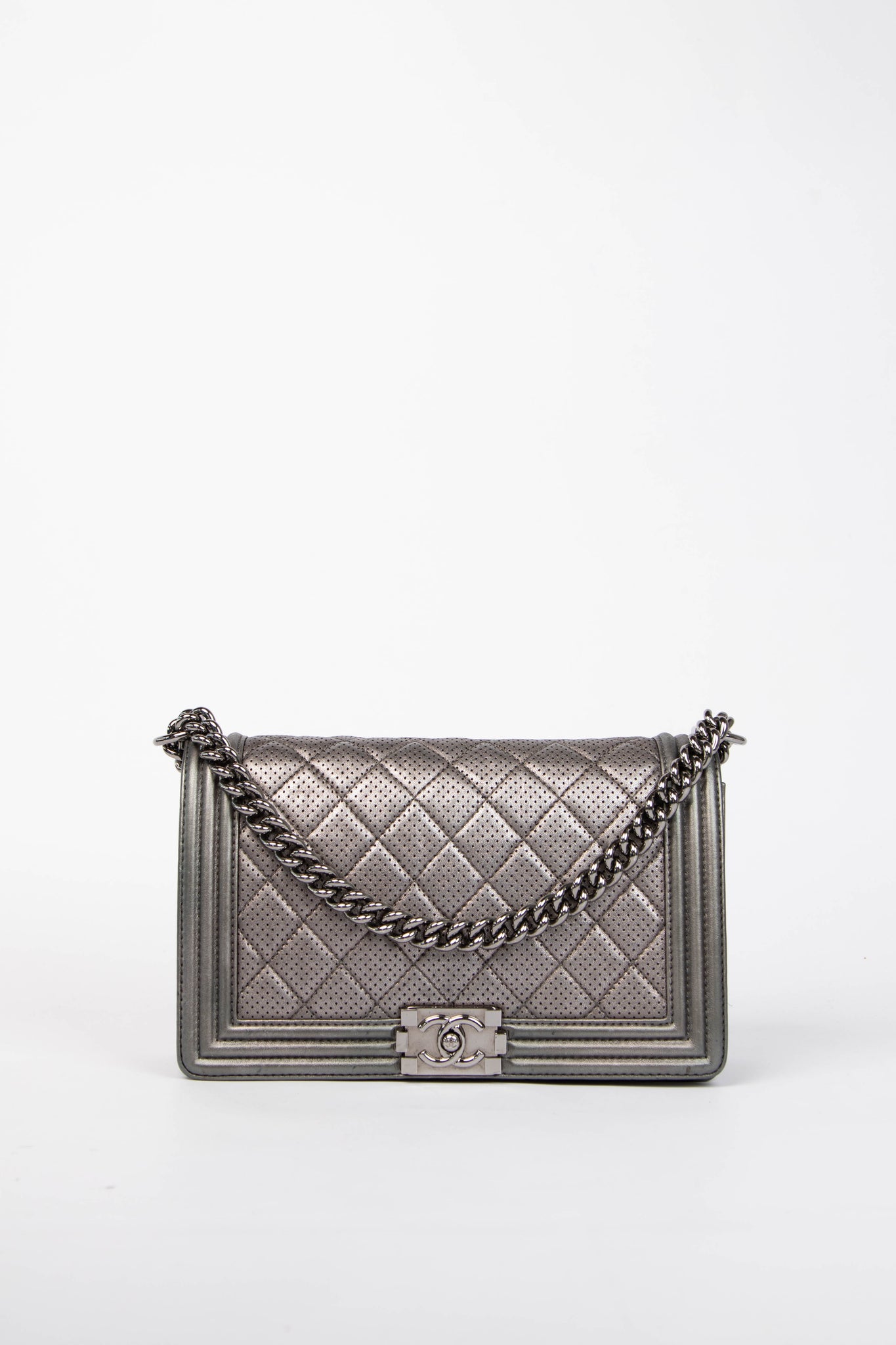 2014 Chanel Silver Perforated Leather Medium Boy Bag