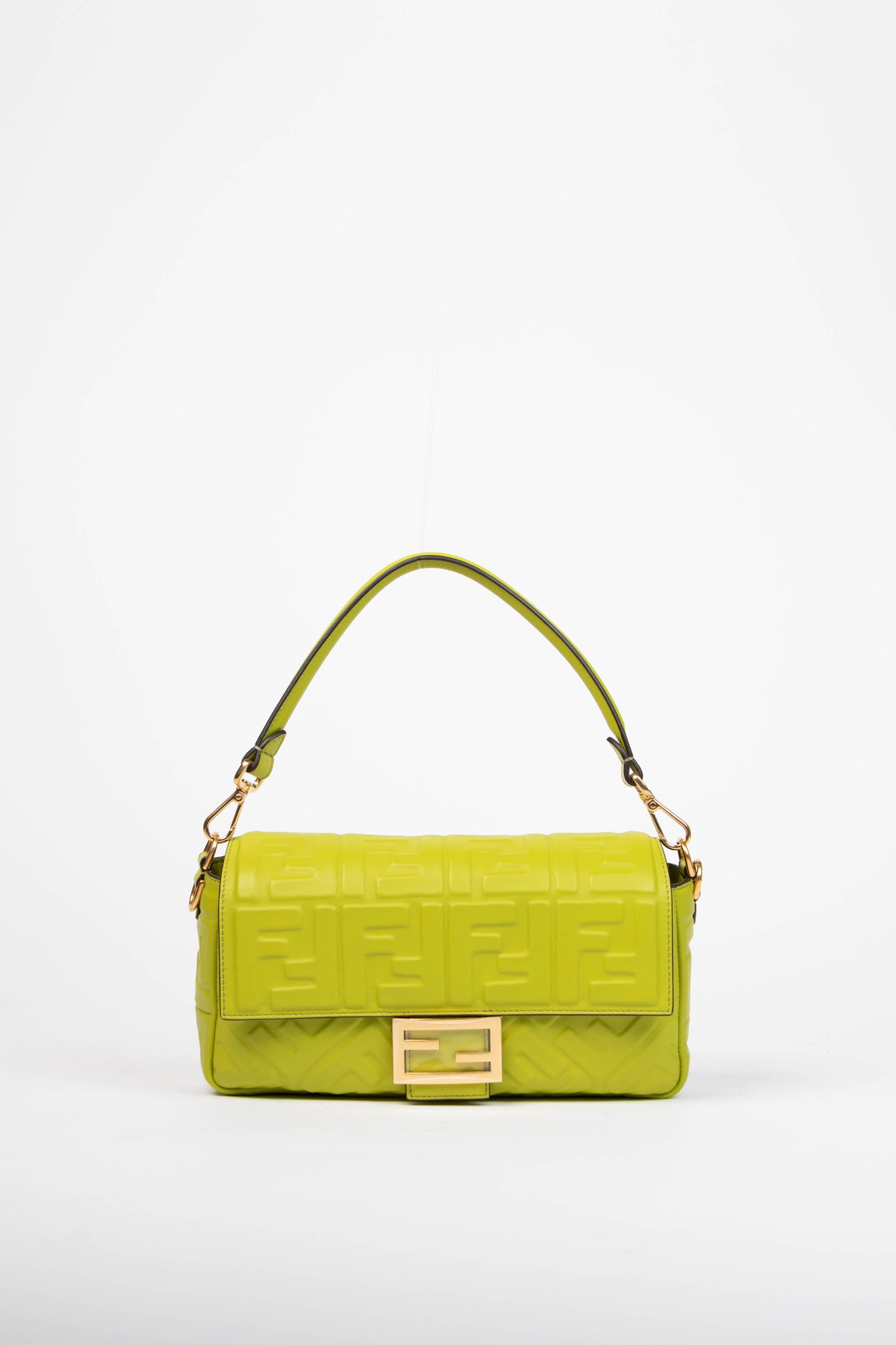 2020 Fendi Green Leather FF Embossed Baguette Shoulder Bag