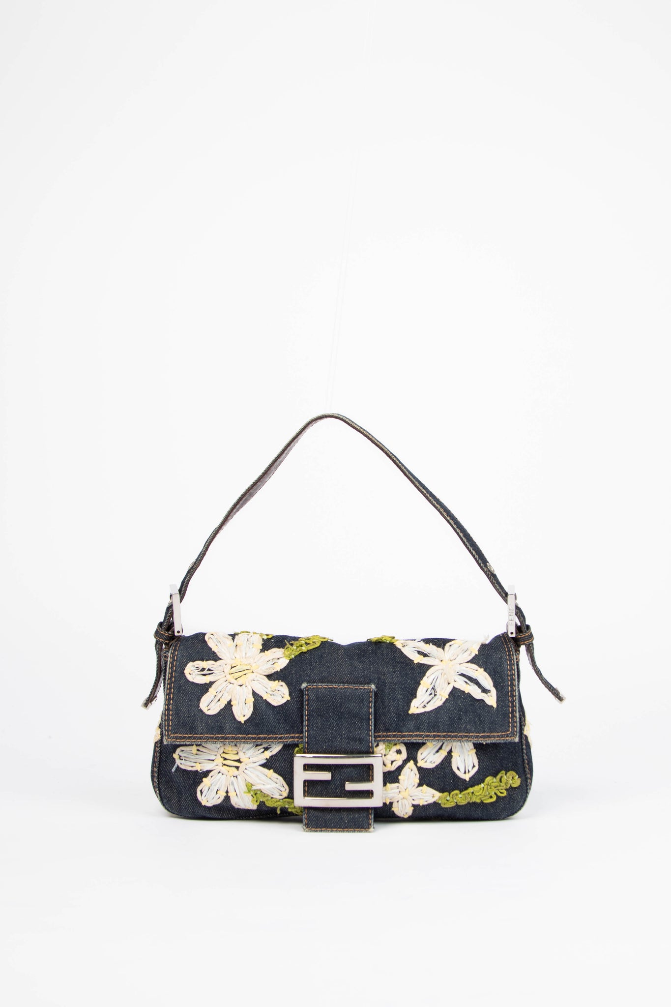 90s Fendi Denim Embroidered Baguette Shoulder Bag
