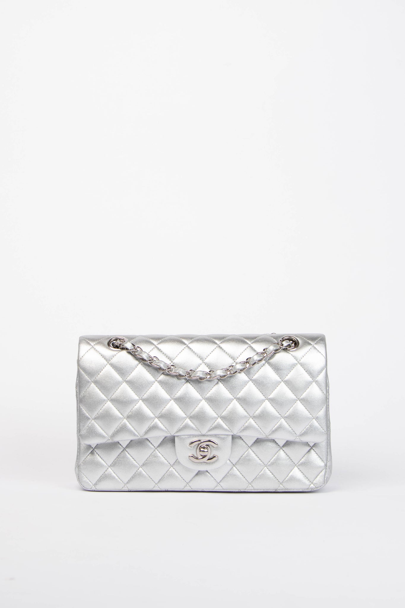 RARE Chanel Silver Lambskin Medium Double Flap Shoulder Bag