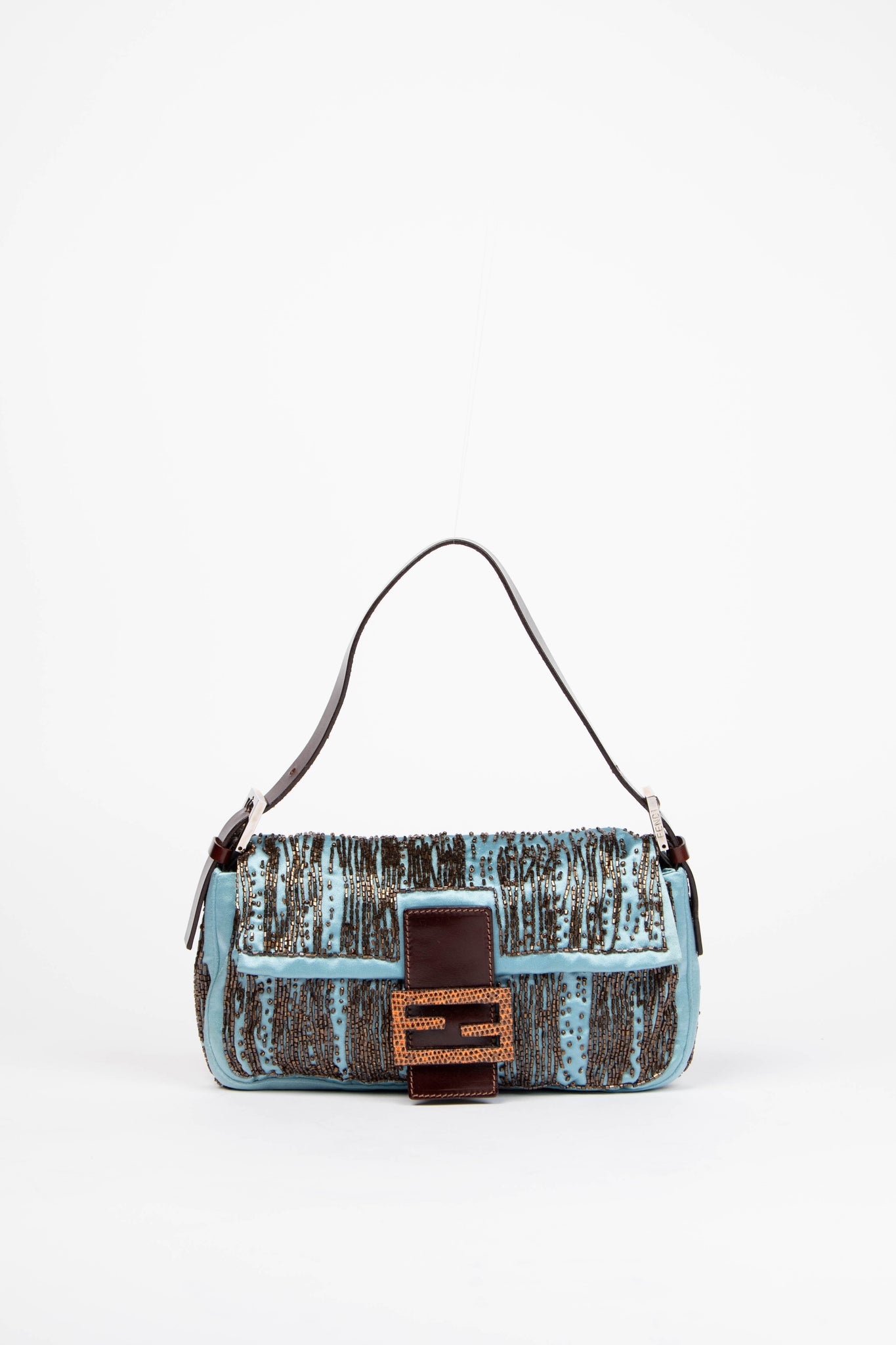 RARE Fendi Blue Satin Beaded Baguette Shoulder Bag