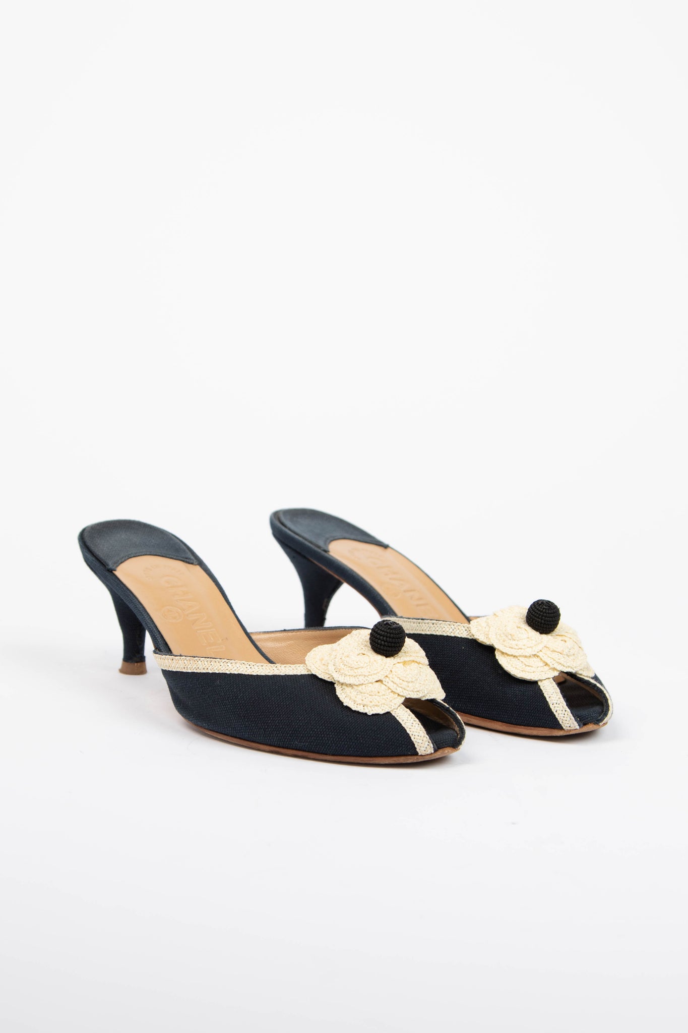 Vintage Chanel Camellia Canvas Peep Toe Heels (EU 36.5)