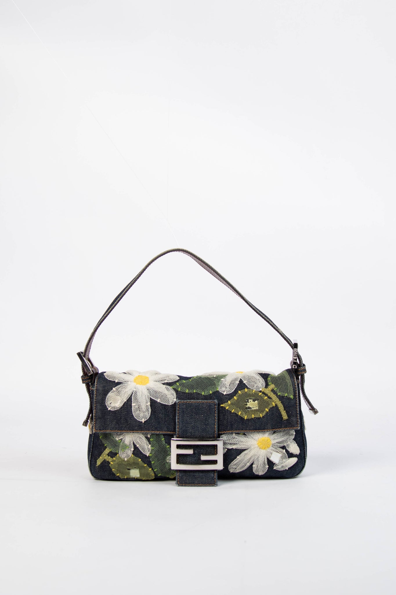 Vintage Fendi Denim Baguette with Mesh Flower Appliqué
